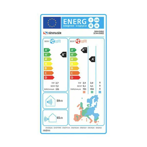 Klima Sinclair SIM/SOM-09BS2, 2.7kW hlađenje, 3.6kW grijanje, A++/A+, WiFi, dimenzije 835x295x208mm, unutarnja jedinica 8.2kg, vanjska 21kg, 2 god