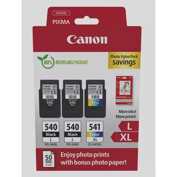 Tinta Canon PG-540L + CL-541XL, 5224B017, 2 Black + 1 Color (Multipack) + Foto papir Canon Photo Paper GP-501